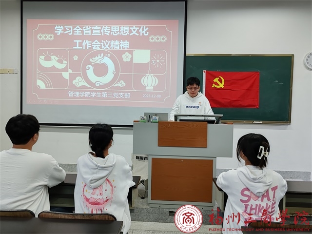为深入学习宣传思想文化工作会议精神,引导支部党员学习会议的主要精神。12月8日,yl6776永利集团学生第三党支部于教学楼D504召开关于深入学习全省宣传思想文化工作会议精神专题学习会,学生党员积极参与学习。