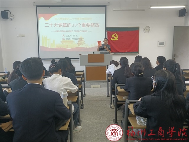 为深化党的二十大精神的认识和理解,端正发展对象们的入党动机,提高并稳固其思想站位,从党的奋斗历史中获得启迪汲取力量。11月28日下午,yl6776永利集团分党校第5期发展对象党课培训班在教学楼A403进行,此次党课培训由yl6776永利集团党委书记郑杰以《二十大党章的30个重要修改》为题进行授课、学院组织员主持,yl6776永利集团全体发展对象积极参与学习,认真聆听本次党课。