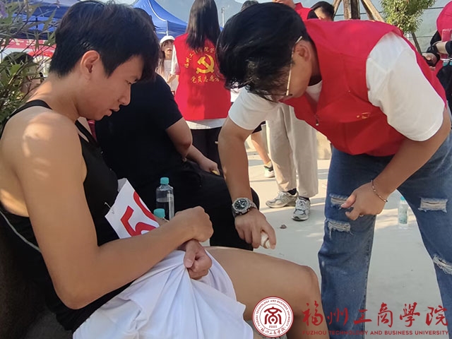 党员志愿者为受伤运动员擦药