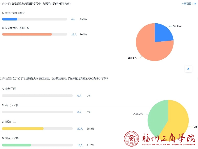 课上,李凡老师先进行了一个现场调查:“在组织行为学课程的学习中,您更倾向于哪种教学方式?”“在开始学习组织行为学课程之前,您组织行为学基本概念和核心要点有多少了解?”“对你认为什么是“组织行为学”?”从调查的结果来看,76.5%学生倾向于互动式教学,58.8%学生对组织行为学了解略知一二,41.2%的学生完全不了解。