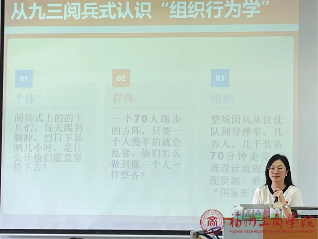 李凡老师根据过去的教学经验,结合本班的学情情况,设计了本次真实情景课堂。总议题为“从九三阅兵式认识“组织行为学”,分设三个子议题:子议题1:个体层面,阅兵式上的的士兵们,每天踢到脚肿,烈日下暴晒几小时,是什么让他们愿意坚持下去?子议题2:一个70人踢步的方阵,只要一个人慢半拍就会乱套,他们怎么做到像一个人一样整齐?子议题3:整场阅兵从仪仗队到导弹车,几万人、几千装备70分钟走完,谁设计流程、谁配资源、谁传递“国家形象”?。三个学习活动依序展开,学生们积极参与,讨论环节气氛热烈,大家纷纷举手发言,各抒己见,课堂氛围活跃。有的学生还主动分享了自己在团队项目中的亲身经历,与阅兵案例相互印证,进一步加深了对组织行为学的理解。本次课程以数据为“钥匙”、以时事为“剧本”,把组织行为学里“个体—群体—组织”三层密码翻译成人人能懂的“大白话”,让学生原来觉得拗口生涩的概变得通俗易懂,很好的激发了学生的学习兴趣。