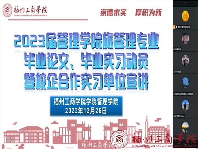 本次会议采用线上会议形式,有效完成实习动员和任务部署。会议伊始,旅游管理专业老师对毕业实习、毕业论文等相关工作进行了安排和指导,并邀请了部分校企合作实习单位进行毕业实习宣讲。紧接着,我院应用网络优势同步邀请永泰具有代表性企业和部分校企合作单位进行毕业实习宣讲,并重点结合学校中心工作服务地方产业助力乡村振兴,为旅游管理省级一流专业应用型人才对接产业提供良好条件。与此同时,我院学生认真做好记录,积极咨询相关岗位具体情况以及职业前景,解决自身在实习、求职方面的诸多疑虑。最后,会议表示我院将积极搭建校企人才供需平台,促进人才供需精准对接。