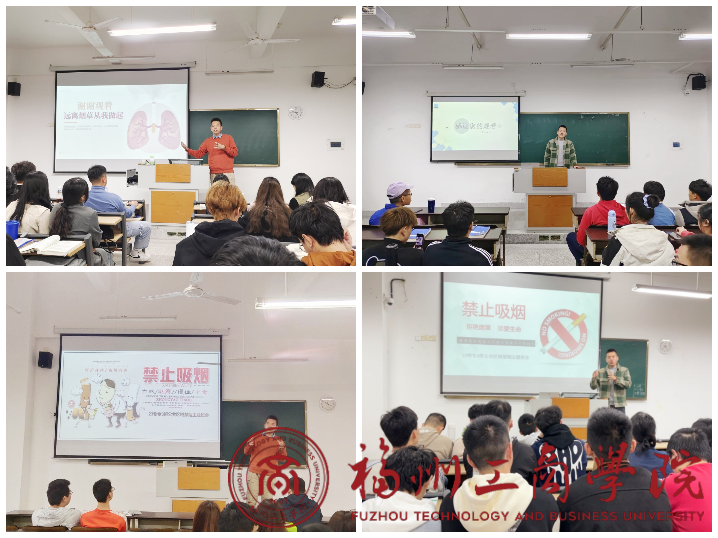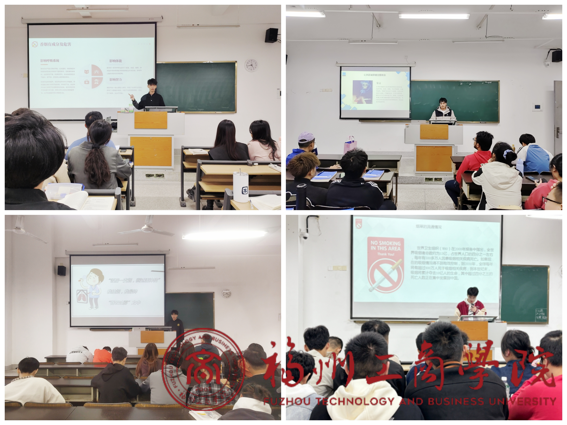 班会上,主持人带领同学们通过观看图片以及讲解、讨论等方式详细介绍了烟草的历史、烟草的有害成分、烟草认知的误区、吸烟与疾病、戒烟的好处、并用典型案例进行了警示教育。同学们逐渐明白了烟草依赖是一种慢性疾病,烟草危害是世界最严重的公共卫生问题之一。班会最后,辅导员刘敏君鼓励全体同学们以身作则,禁止在办公楼、教学楼等教学区域公共场合吸烟,营造无烟教学环境,进一步增强了同学们的禁烟意识和社会责任意识。