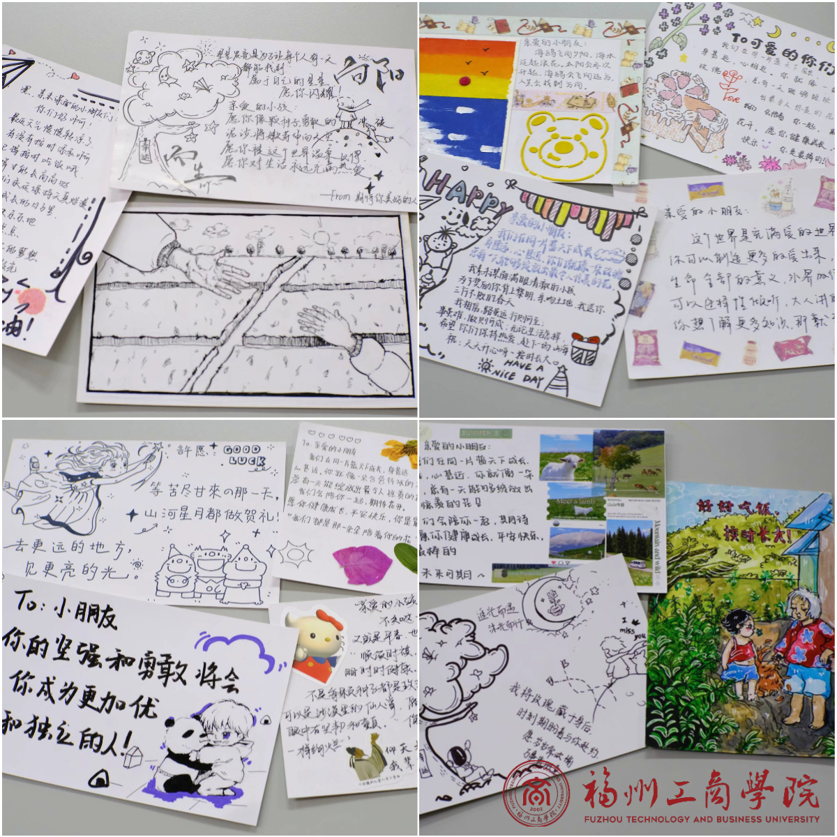 活动过程中,同学们踊跃参加活动,他们认真的在明信片上一笔一划地写下、绘上对留守困境儿童的祝福和鼓励。用远方的祝福成为他们前进道路上的陪伴,给予一缕寒冬中的暖意。线上方式开启,在对优秀作品的鼓励的同时,也是为留守儿童的送上一份礼物。