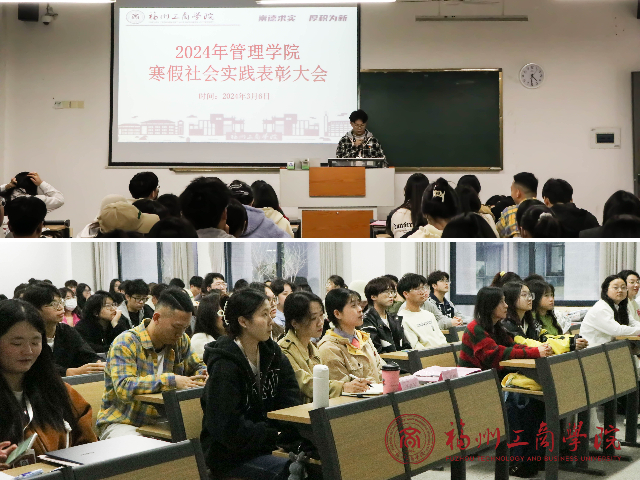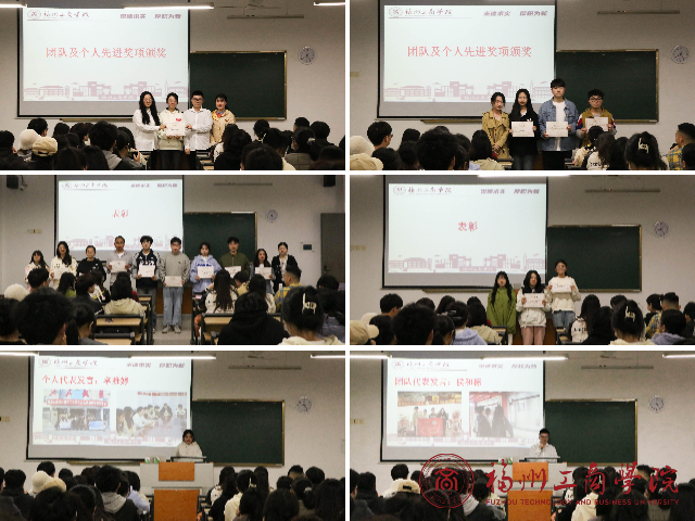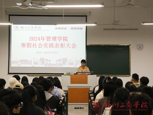 大会通过照片回顾了学生寒假实践成果,学子们的全心投入将参会人员带回到了寒假期间的实践当中,感受管院学子深入实践、走向基层、触摸社会、磨砺本领的激情和风采。随后,与会领导、老师为寒假社会实践获奖成员颁奖。优秀团队代表侯和标和先进个人代表卓雅婷上台发言。他们回顾投入社会实践的经历,表示将心怀国家,刻苦学习,勤于实践,担负起当代青年的责任与使命。