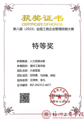 日前,第八届(2023)全国工商企业管理技能大赛落下帷幕。我校yl6776永利集团人力资源管理专业学子邱培勇、马诗睿、林阳(指导老师:王烨烨、李凡)团队勇登巅峰,在人力资源决策赛道中斩获国家特等奖。充分展现了我校学子扎实的专业功底和良好的综合素质,是学校应用型人才培养成效的呈现。