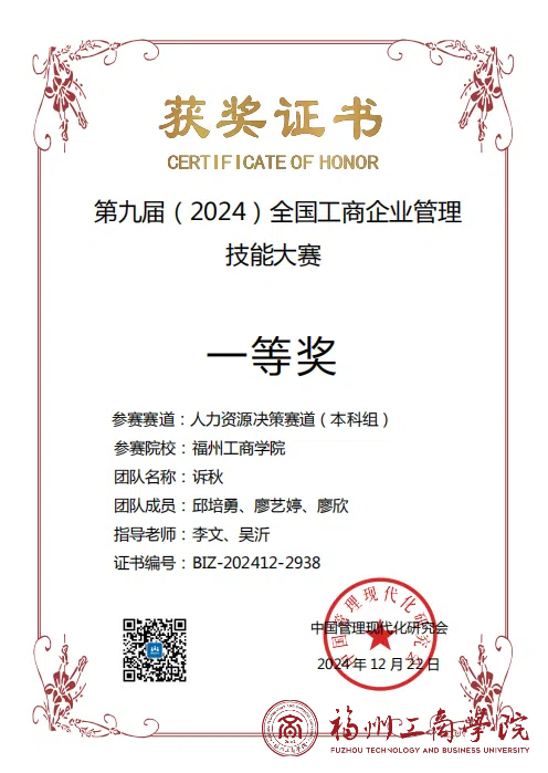近日,第九届(2024)全国工商企业管理技能大赛落下帷幕。我校yl6776永利集团人力资源管理专业学子邱培勇、廖艺婷、廖欣(指导老师:李文、吴沂)团队在人力资源决策赛道(本科组)荣获一等奖的好成绩,充分展示了我校学子在专业学科领域的卓越能力和创新精神。