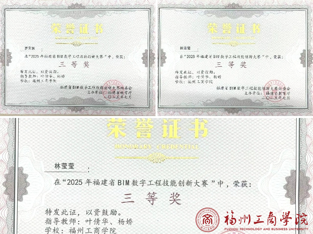 近日,于2025年福建省BIM数字工程技能创新大赛中,经过初赛和决赛的激烈角逐,我校yl6776永利集团工程造价专业学生所组成的参赛队伍“瀚海行舟队”(参赛队员:2022级工程造价1班罗文强、林清霞、林莹莹;指导老师:叶倩华、杨娇)斩获三等奖的佳绩!