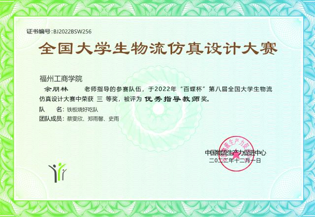 近期,2022年“百蝶杯”第八届全国大学生物流仿真设计大赛顺利举行。大赛吸引了三明学院、苏州大学、南宁师范大学等共30个省、自治区的343所院校621支队伍报名参赛。我校学子经过激烈角逐,最终获得三等奖1项。