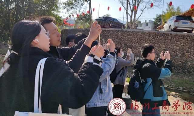 在理论教学过后,同学们乘坐大巴前往榕水谣进行拍摄实践活动。同学们以现场构思、现场拍摄、现场剪辑出片的方式,在陈老师的带领下,把刚刚学到的“运镜手法”“景别”等理论知识投入实践,在实际拍摄中提高在短视频领域中的综合能力。
