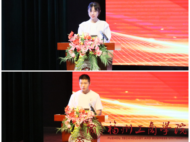 新生代表2023级工商管理专业学生陈玫尹和2023级人力资源管理专业专升本学生张欣分别发表了讲话。她们表达了对大学生活的憧憬和期待,并表示将努力学习专业知识,积极参与各种活动,为学院争光添彩。